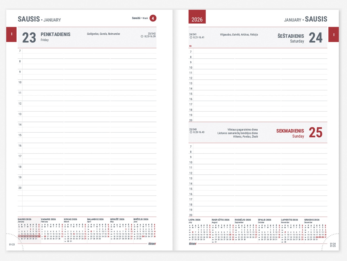 • priedai: spalvotas Lietuvos žemėlapis, spalvotas Europos žemėlapis, informaciniai lapai, metinis planas, atostogų planas, 2025 ir 2027 metų kalendoriai, tarptautinių telefonų kodų, Lietuvos miestų telefonų kodų, mato vienetų bei svorių, atstumų tarp Lietuvos miestų lentelės, papildomi puslapiai kontaktams ir pastaboms;