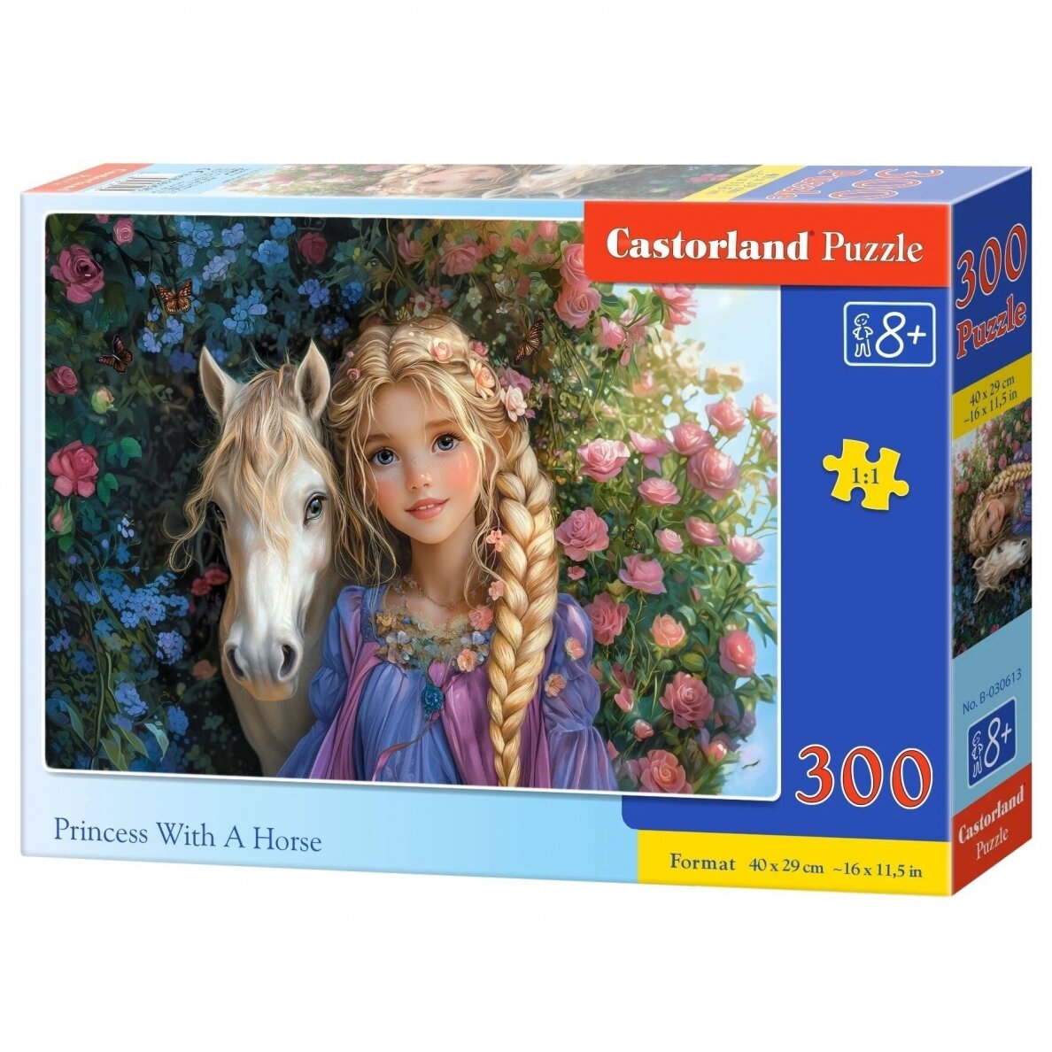 300 detalių dėlionė su pasakišku motyvu – princesė ir jos ištikimas arkliukas žydinčiame sode. Švelnios spalvos, draugiški personažai ir pasakų atmosferą kuriantis vaizdas kviečia vaikus į ramią, kūrybišką veiklą.