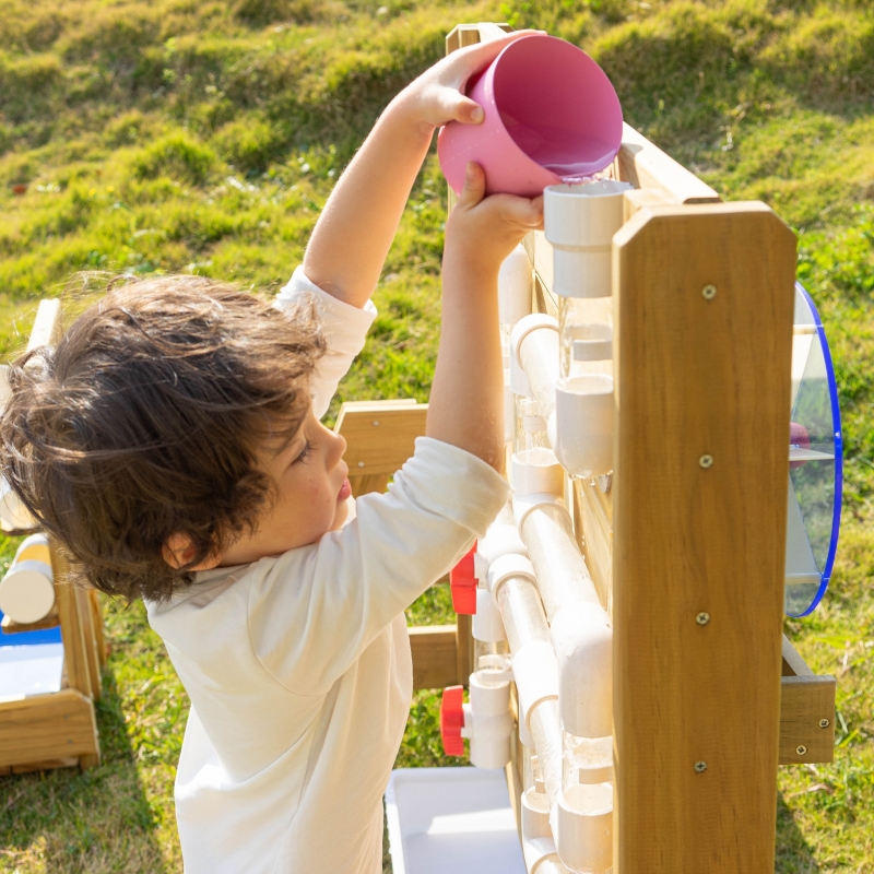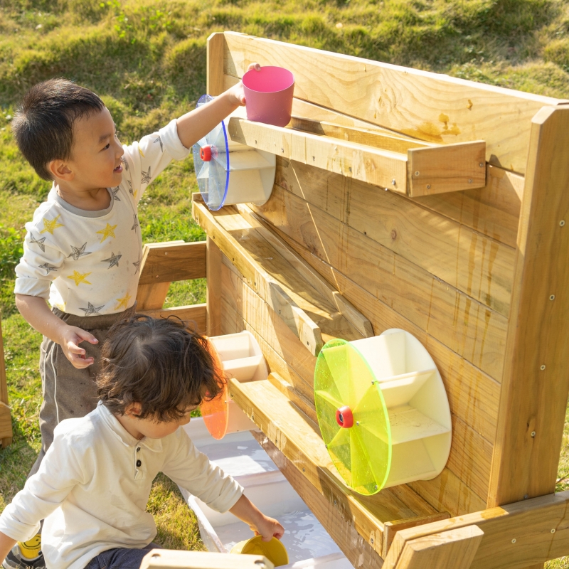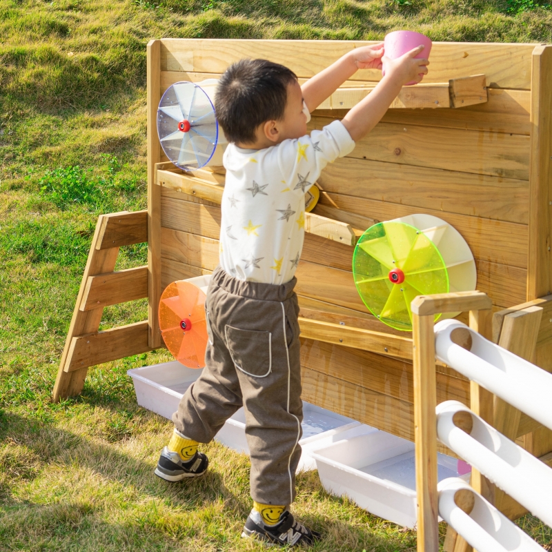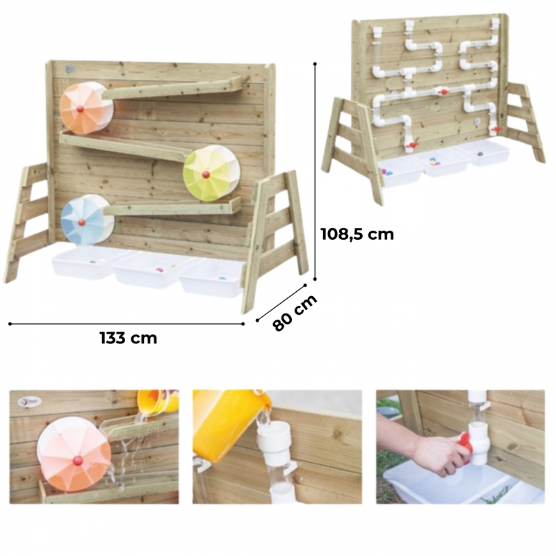 Garsaus prekės ženklo „Classic World“ medinė sienelė. Ji pagaminta iš aukštos kokybės medienos ir dažyta netoksiška impregnatūra, todėl yra visiškai saugi vaikams. Užberkite smėlio ant medinės lentynos ir stebėkite, kaip jis krenta žemyn, o smėlio malūnas pradės suktis. Kitoje sienos pusėje yra tuneliai, į kuriuos galite pilti vandenį. Ši smagi veikla bus mokymosi patirtis, kaip varyti ir užvesti ratą.