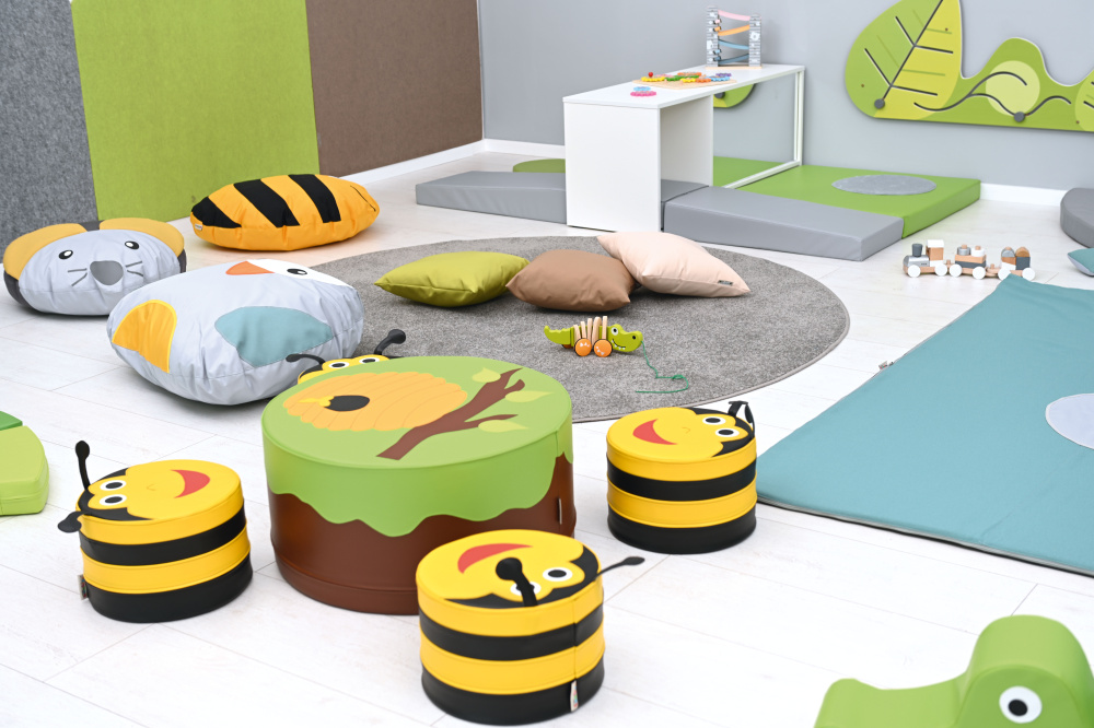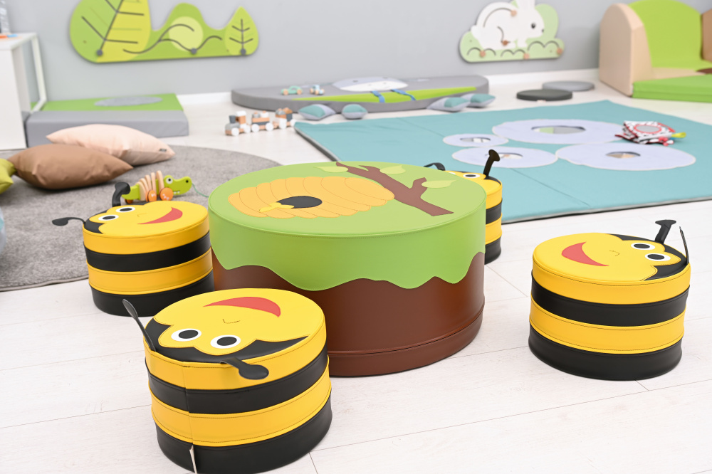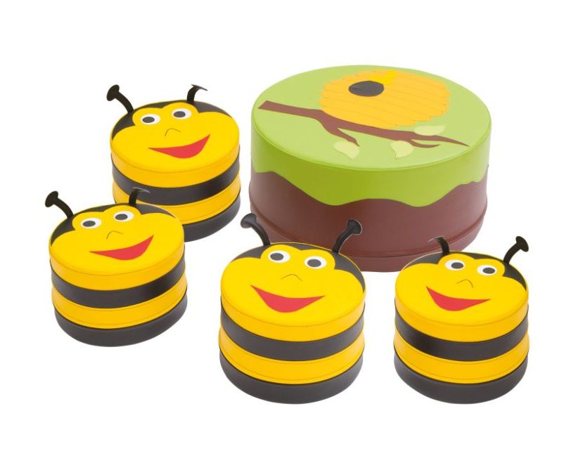 Putplasčio komplektas, kurį sudaro stalas ir 4 sėdynės. Šis spalvingas komplektas su bitės motyvu puikiai tinka žaidimų kampui. Užvalkalai su užtrauktukais, pagaminti iš lengvai valomos „Meditap“ medžiagos. • Stalas: skersmuo 60 cm; aukštis 30 cm • Sėdynės: skersmuo 30 cm; aukštis 20 cm