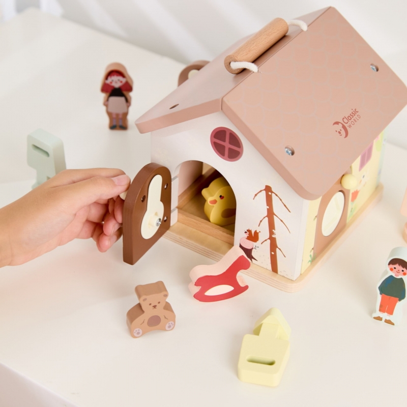 Medinis edukacinis namelis su spynomis yra sensorinis žaislas, skatinantis mažylius leistis į įdomius tyrinėjimus! Šis žavus namelis iš CLASSIC WORLD turi keturias duris, kurių kiekvienos turi išmanų užrakinimo mechanizmą. Šio žaislo idėja – priderinti tinkamos formos raktą prie atitinkamų durų (su tokia pačia atidarymo anga). Viduje tyrinėtojo laukia spalvingos kaladėlės su linksmomis iliustracijomis, kuriose, be kita ko, pavaizduotas mažas meškiukas ir gimtadienio dovana, puikiai atitinkantys žaislo temą. Kiekvienų durų atidarymas ir uždarymas puikiai lavina smulkiąją motoriką, miklumą ir loginį mąstymą. Pagamintas iš patvarios, saugios medienos, žaislas skirtas įkvėpti atradimo džiaugsmą ir vaizduotę 18 mėnesių ir vyresniems vaikams. Savybės: