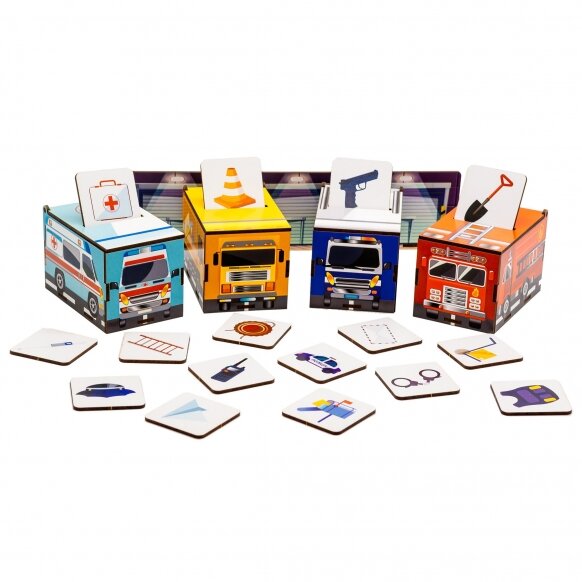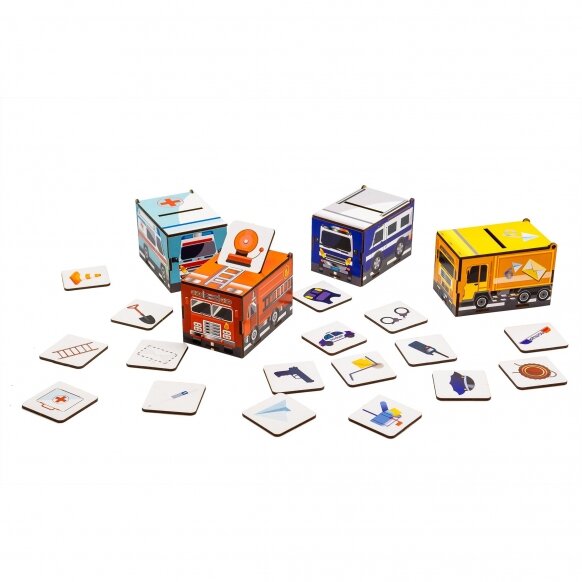 Kiekvieno „automobilio“ viršutinėje dalyje yra plyšiai, pro kuriuos reikia įdėti plokšteles su daiktų atvaizdais.
