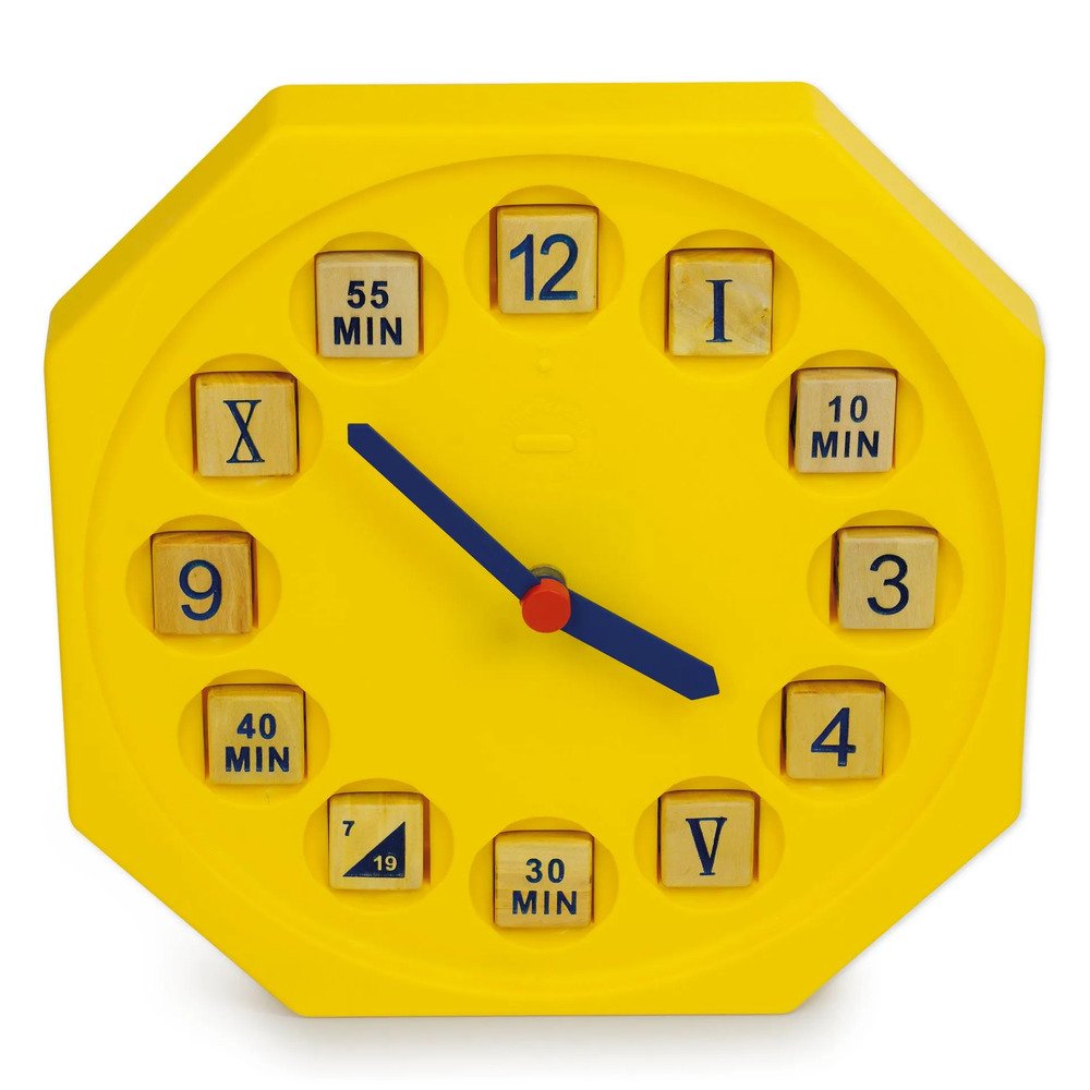 Vietoje įprasto ciferblato laikrodis turi 12 kvadratinių įdubų, skirtų įdėti 12 medinių kubelių. Juos galima pritaikyti pagal esamus mokymosi poreikius.
