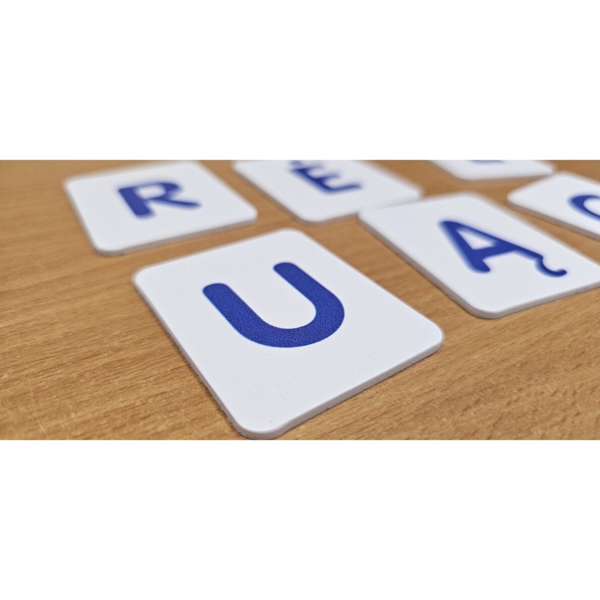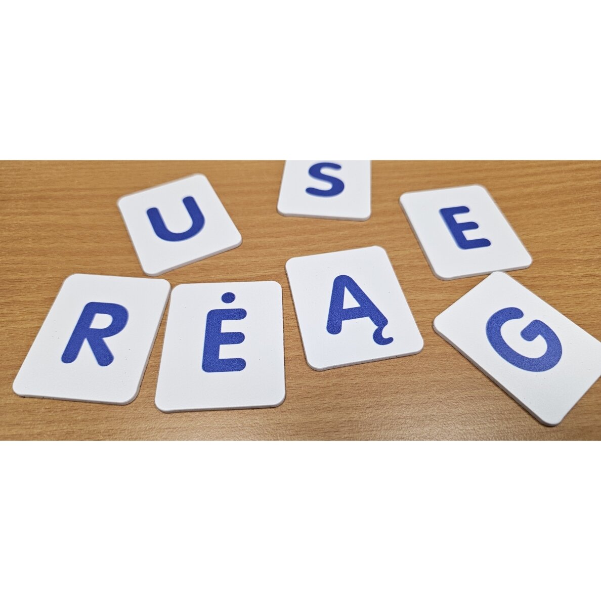 Norintiems lengviau ir greičiau išmokti skaityti ar patiriantiems sunkumų jungiant raides į skiemenis ir žodžius siūlome rinkinį raidžių kortelių, iš kurių bus galima dėlioti ne tik žodžius, bet ir trumpus sakinius. Raidžių rinkinį sudaro 74 plastiko kortelės (dydis – 45 x 55 mm, storis – 2 mm).