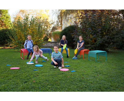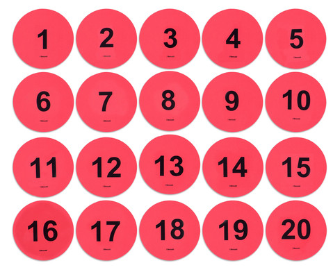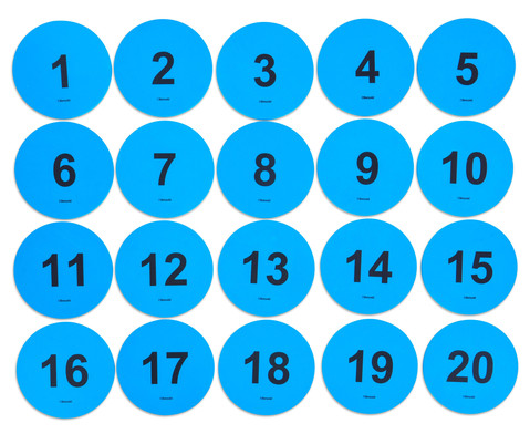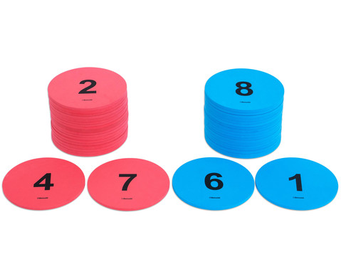 Minkšti putgumės kilimėliai, kurių skersmuo 25 cm. Rinkinį sudaro 20 raudonų ir 20 mėlynų kilimėlių.