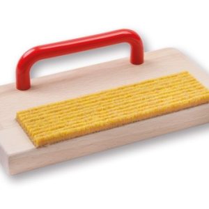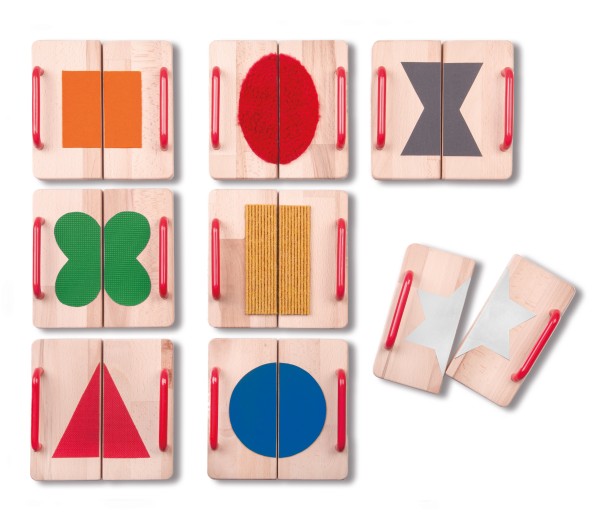 16 buko medienos elementų, 18 x 9 cm, pagaminti iš įvairių medžiagų (meškiuko audinio, veltinio, Tretford kilimo, porolono, veidrodinės folijos, švitrinio popieriaus, lipnių tvirtinimo detalių ir sportinio kilimėlio audinio), įvairių formų (apskritimo, elipsės, dobilo lapo, žvaigždės, trikampio, kvadrato, stačiakampio ir smėlio laikrodžio) ir spalvų, kiekvienas su raudona plastikine rankena, supakuoti tvirtoje dėžutėje. Skirta 3 metų ir vyresniems.